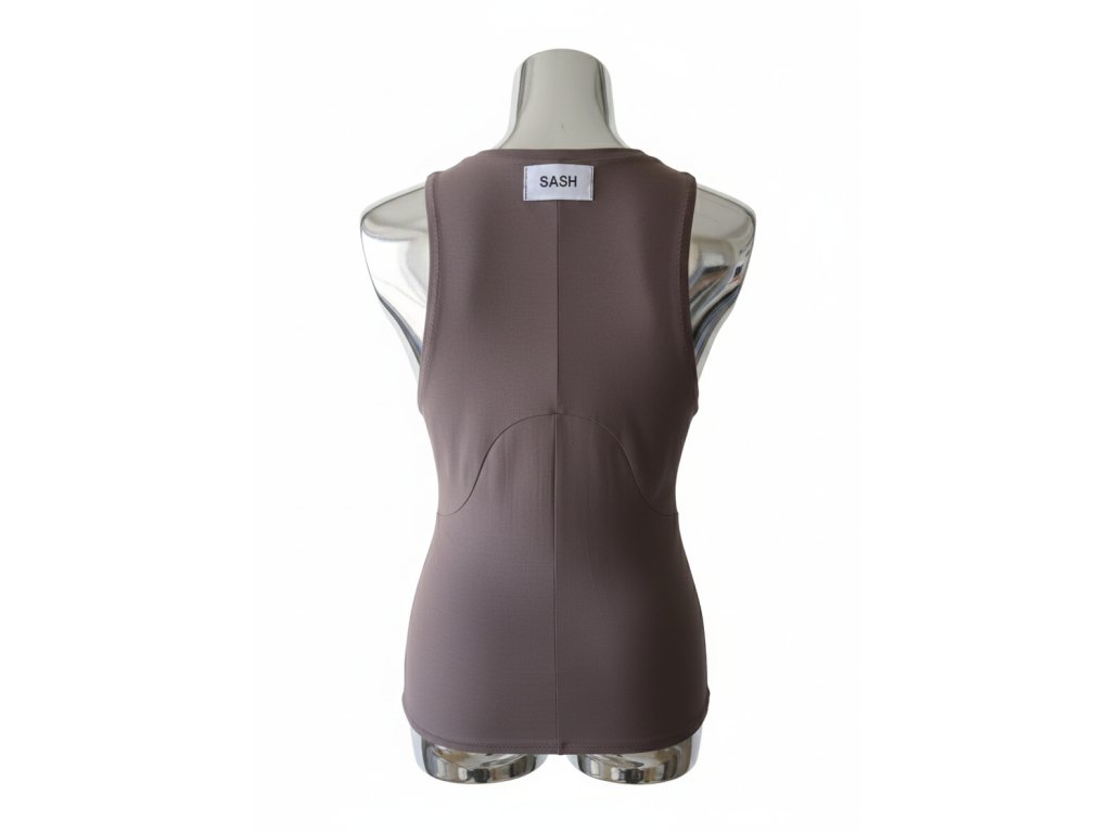 Přiléhavý pružný top bez rukávů. Vyznačuje se vertikálním předním a zadním švem a členícími křivkovými švy v oblasti pasu. Ideální jako elegantní athleisure base kousek.